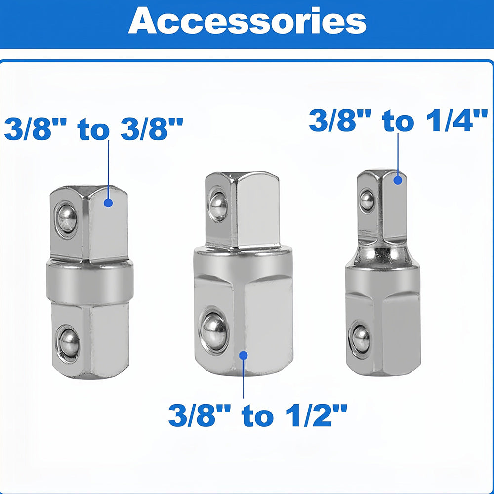 - Multiple Square Drive Adapters: Includes 1/4", 3/8", and 1/2" adapters, allowing compatibility with a wide range of sockets.