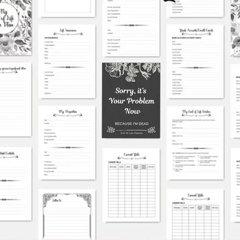 Our thorough and funny End of Life Planner covers everything your family and/or friends will need to know upon your passing or incapacitation.... from Financial Information to Insurance Information to End Of Life Care Wishes and more!