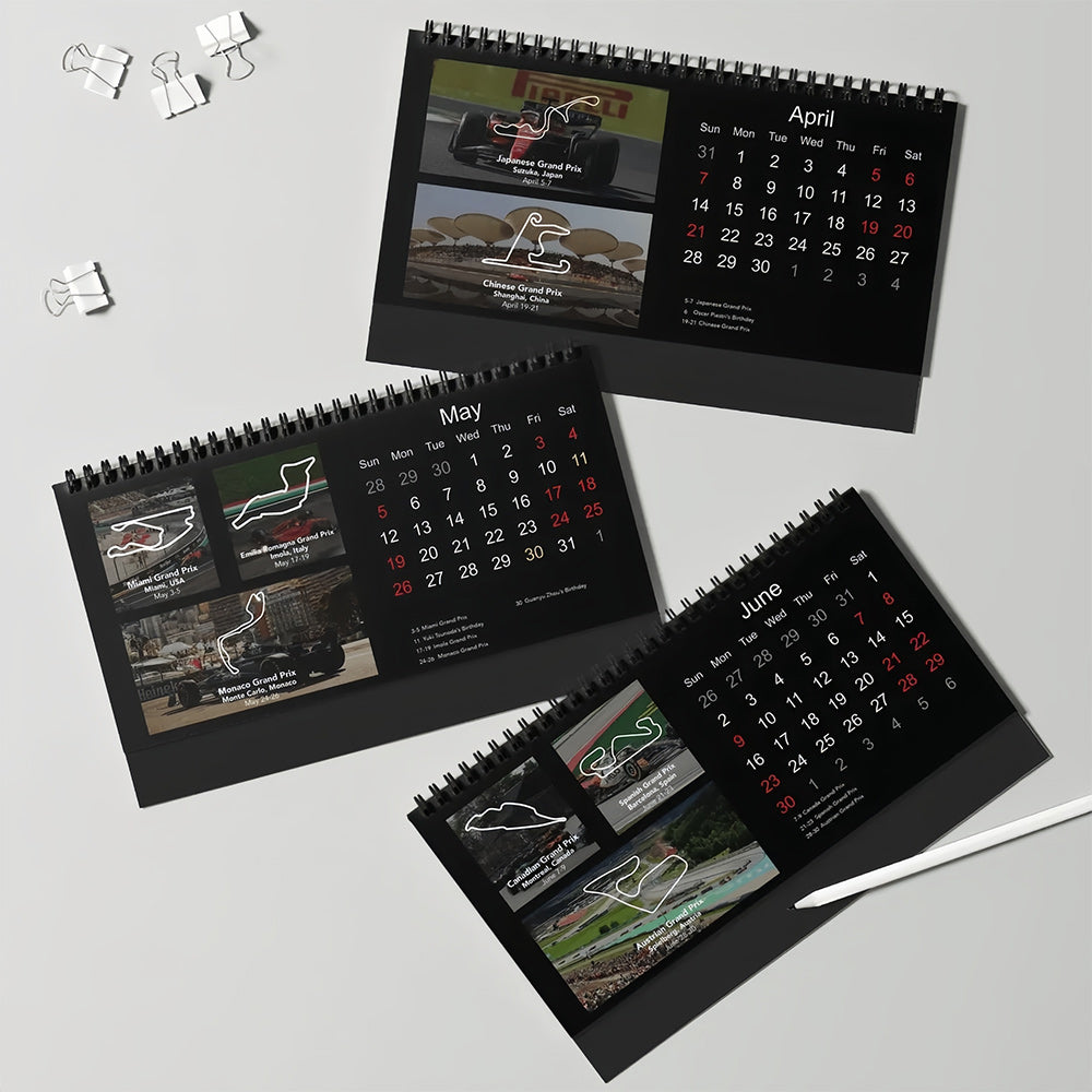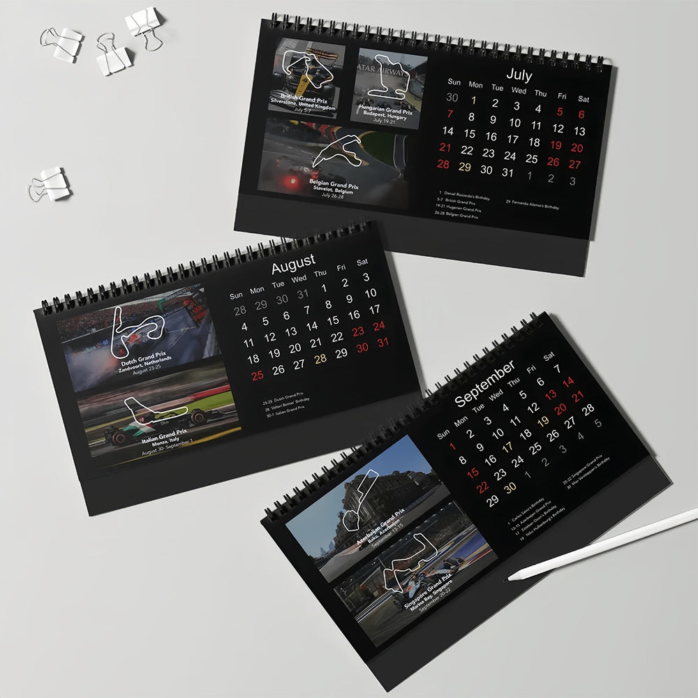 - Race Track Layouts: Each month features a detailed layout of one of the iconic tracks from the F1 circuit.