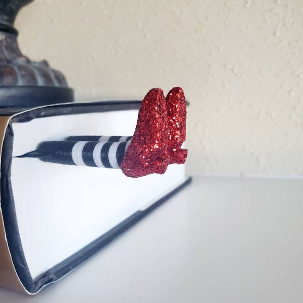 This playful and quirky bookmark features the iconic striped legs and glittering red shoes of a witch, sticking out from the pages of your book, as if sheās been squished flat between the chapters.