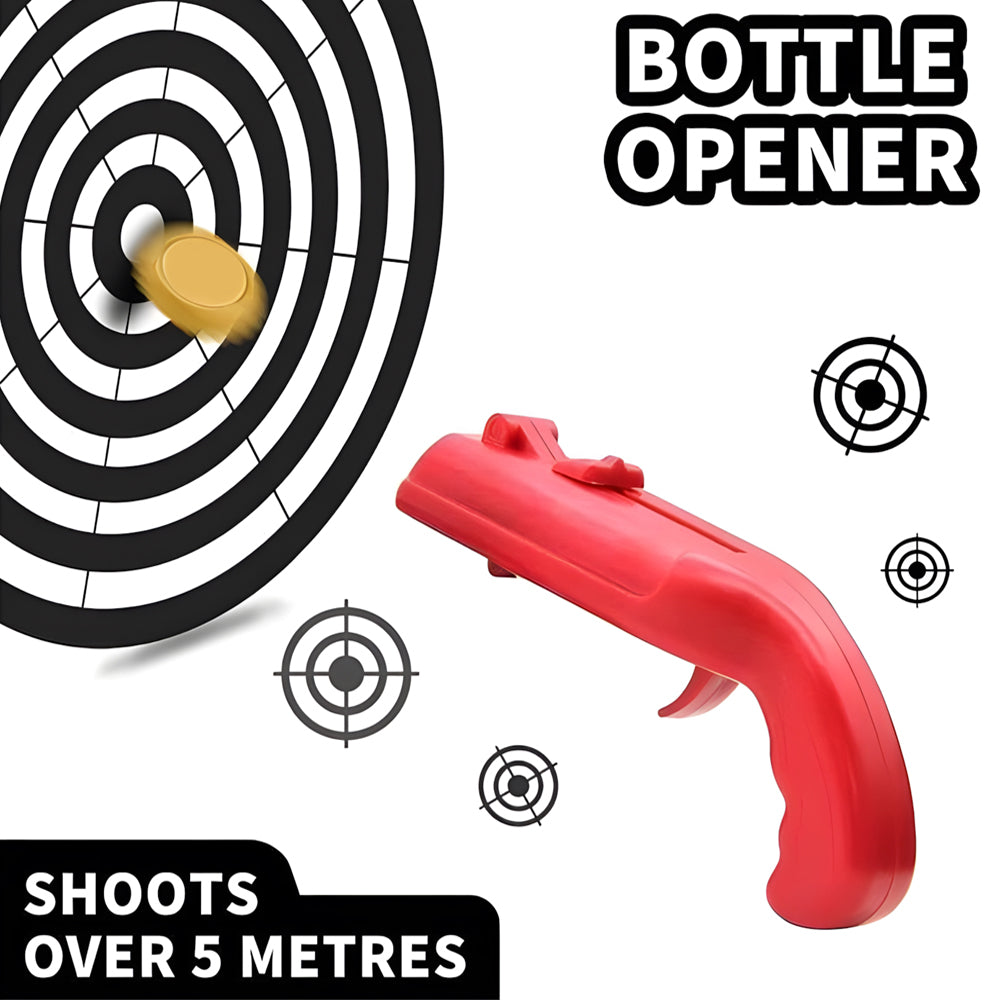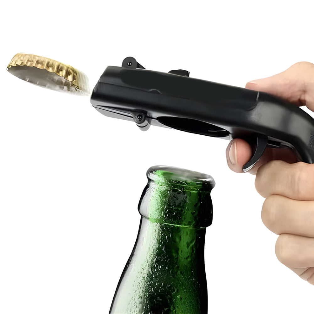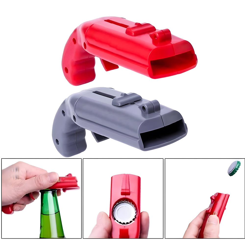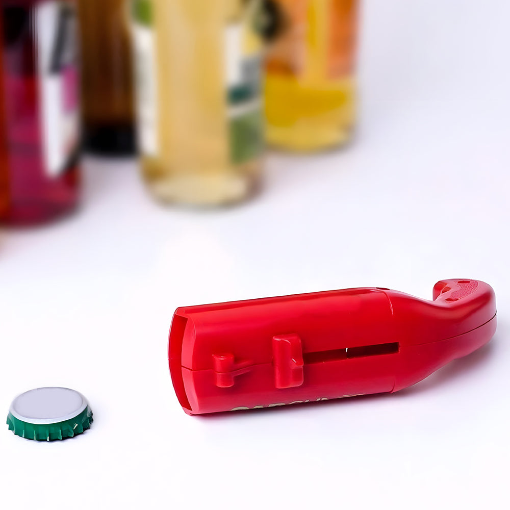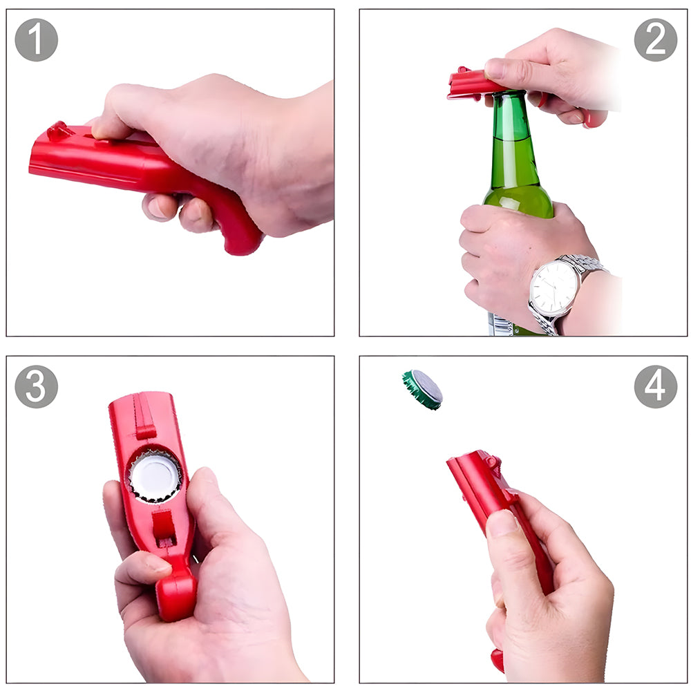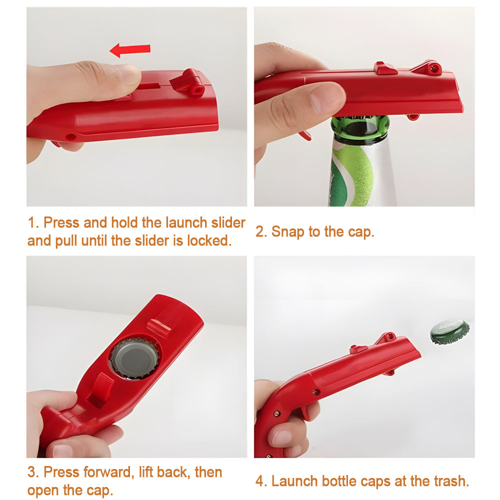 - CAP GUN LAUNCHER: You could take this bottle opener as a cap launcher. It allows you to open the bottle with minimal force. You hold the cap fixed and then it pops up safely and shots the cap more than 5 meters.