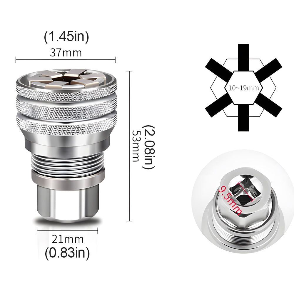 • Adjustable Design: It can be adjust from 10mm to 19mm(0.39” to 0.75”), making it accommodate nuts of various sizes. Instantly adjusted to grip most nuts, no need to change the sleeve of different sizes frequently.