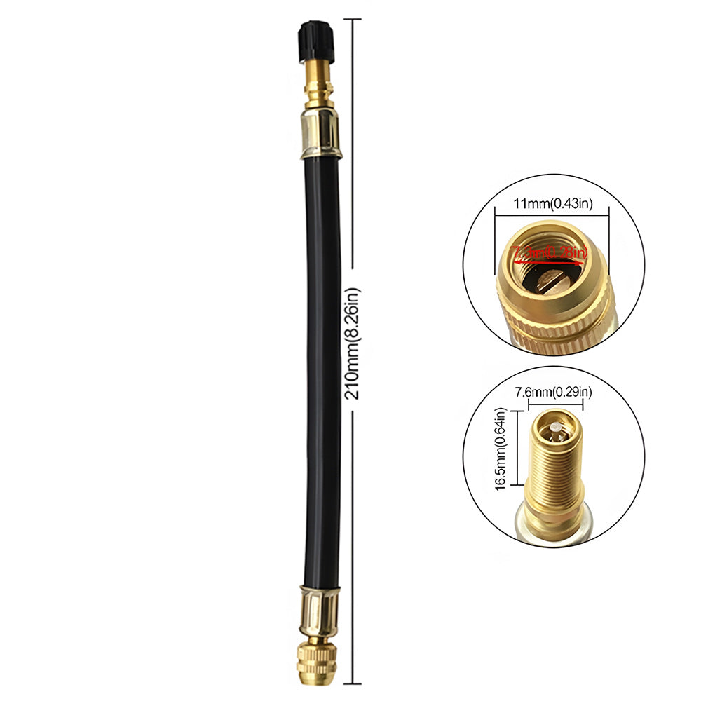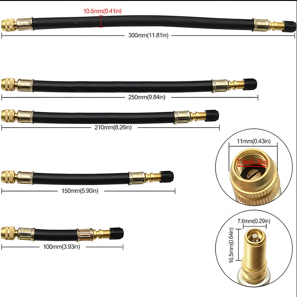 These universal flexible long tire valve extenders successfully solve a series of operations, such as the inability to pump or check the air pressure due to insufficient space between the valve and the spokes or the inconvenient position and angle of the valve. Thanks to the built-in valve core, it can be inflated and deflated, which is convenient and fast.