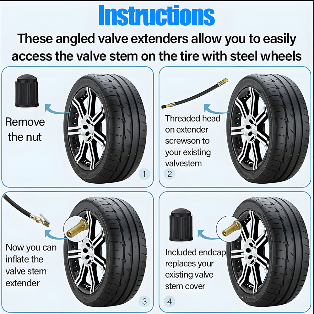 - Easy To Install: These angled valve extenders allow you to easily access the valve stem on tires with steel wheels, convenient for pumps or air tubes, the bottom of the extender rotates freely, easy to operate, no tools required