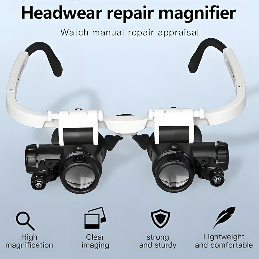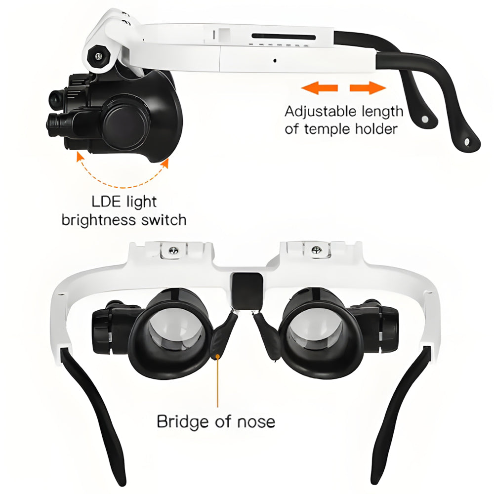The loupes are mounted on the black eyeglass frames and can be adjusted for comfort while keeping your hands free.
