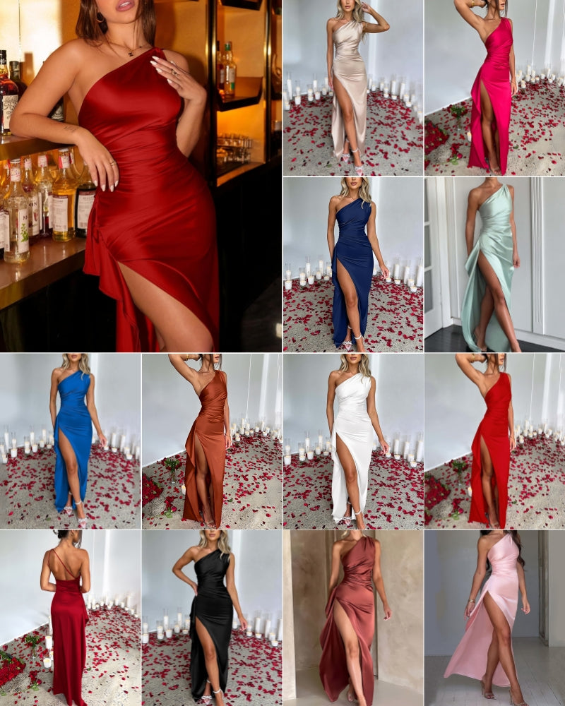 - 1 x Women's Sexy One Shoulder High Split Cocktail Wedding Party Slit Satin Maxi Dress