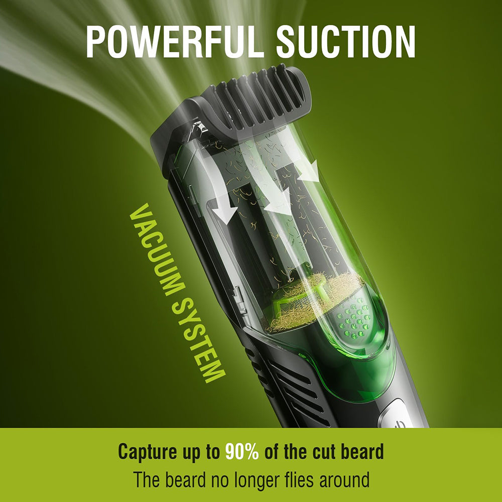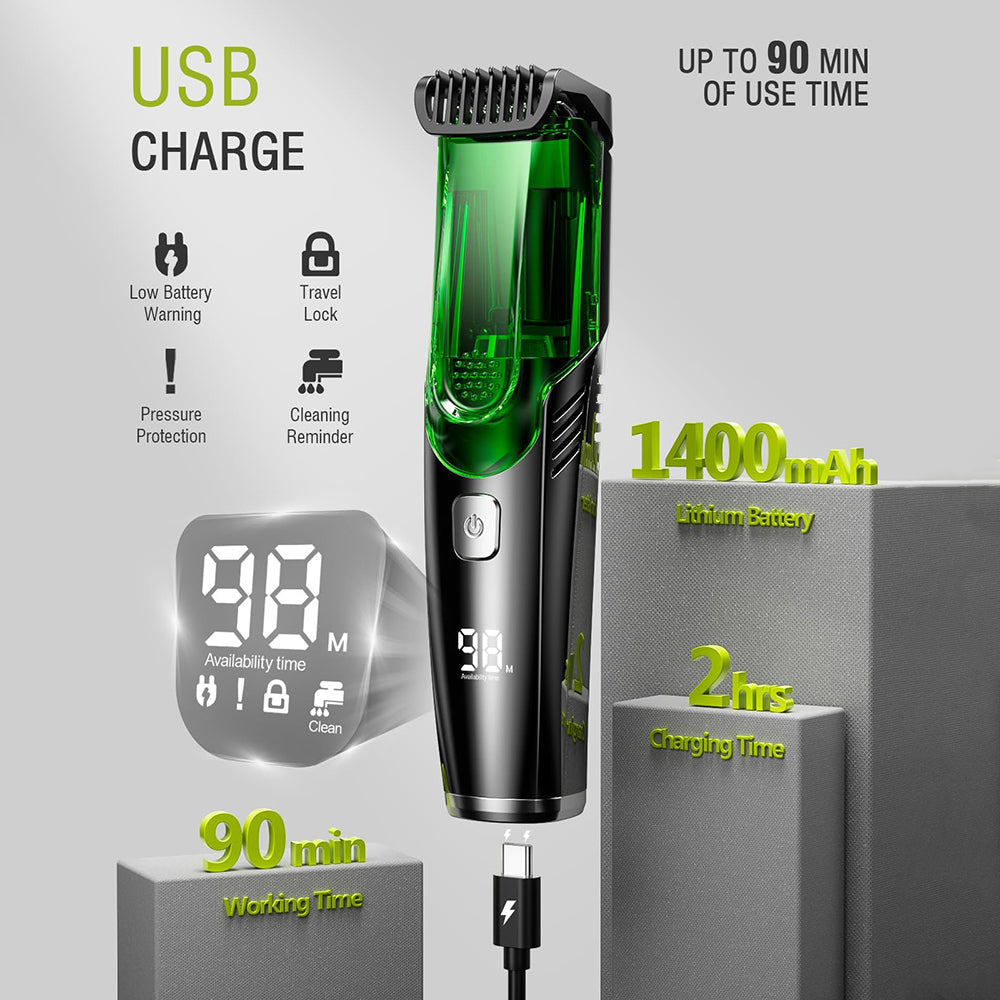 - Vacuuming design, effortless cleanup: Experience a mess-free grooming routine with our Vacuum Beard trimmer for men. Our built-in super suction vacuum trimmer effortlessly captures trimmed hair in an internal compartment for easy disposal and cleaning. Say goodbye to scattered beard on your sink and floors