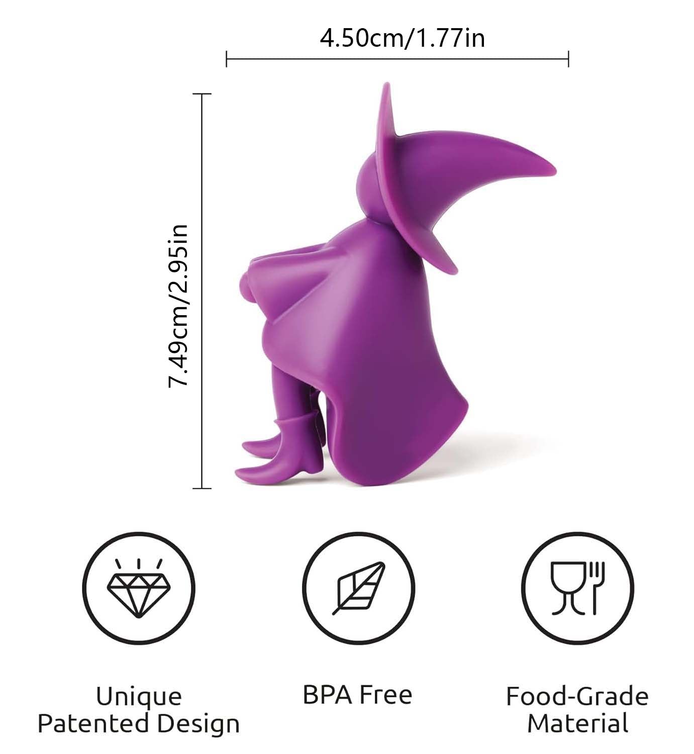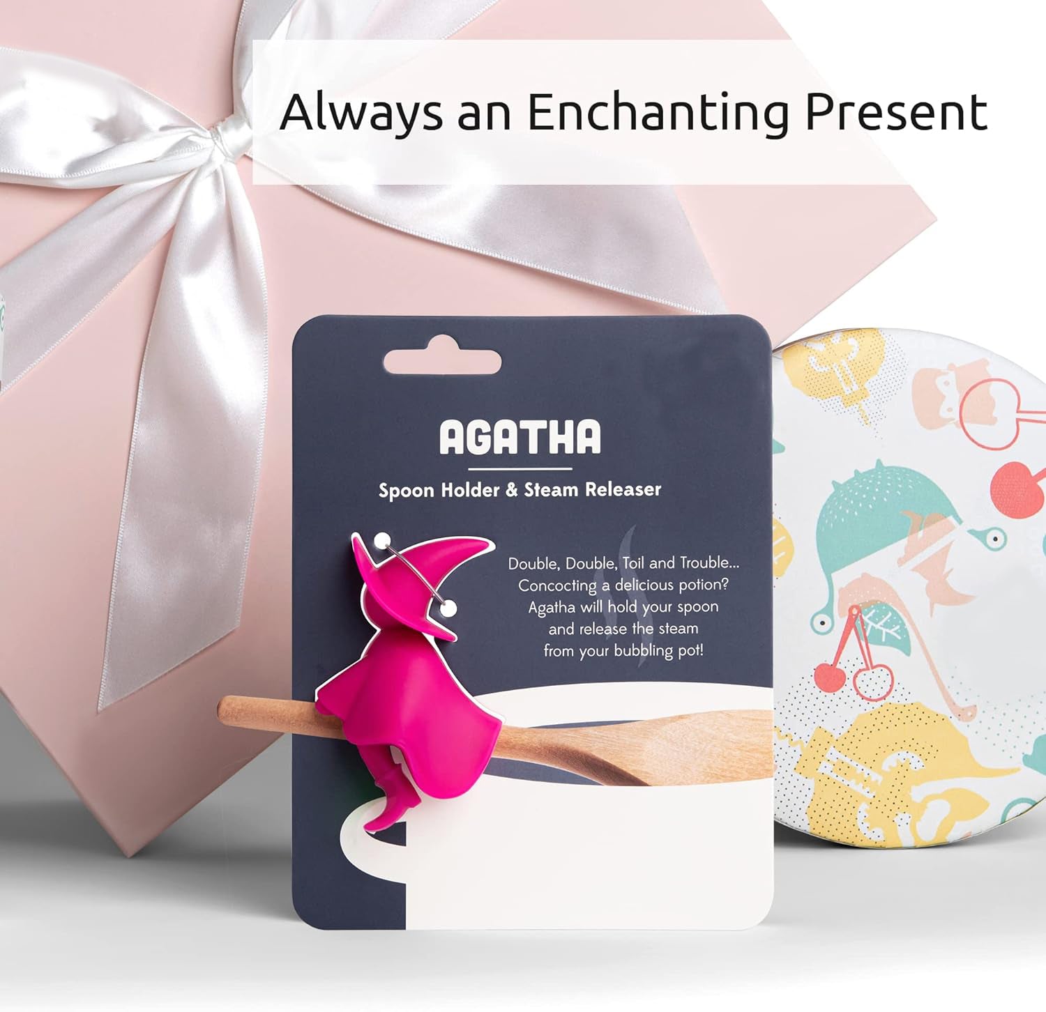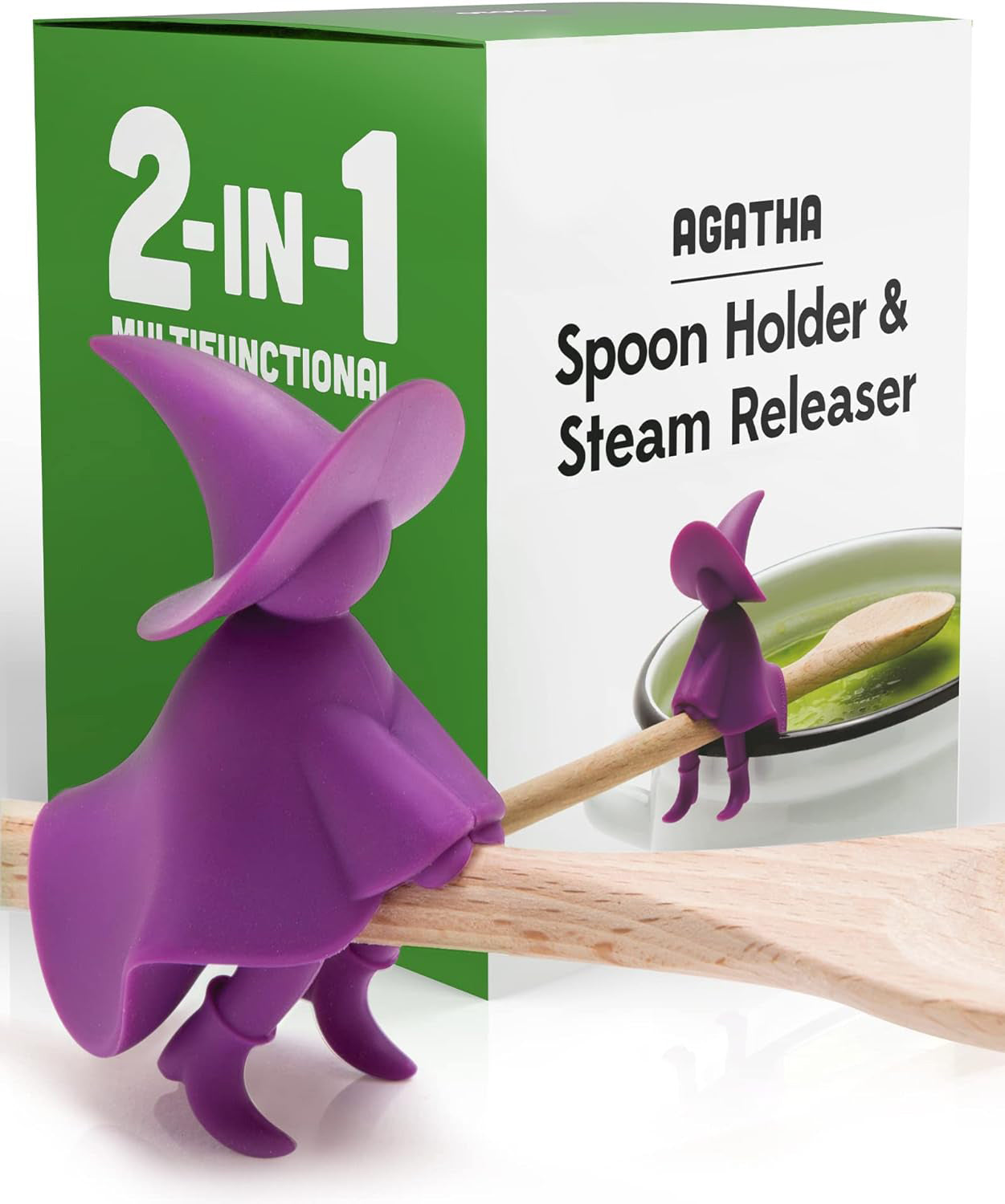 - Bewitching Cooking Preparations: Concoct delicious recipes hassle-free with Agatha. Whether you're using a spoon, spatula, spaghetti tongs or a ladle, this mischievous little witch changes your life. No need to scatter your utensils on a tray anymore. Leave it on your pot to save valuable space. When you're done, simply put Agatha in the dishwasher for quick and easy cleanup.