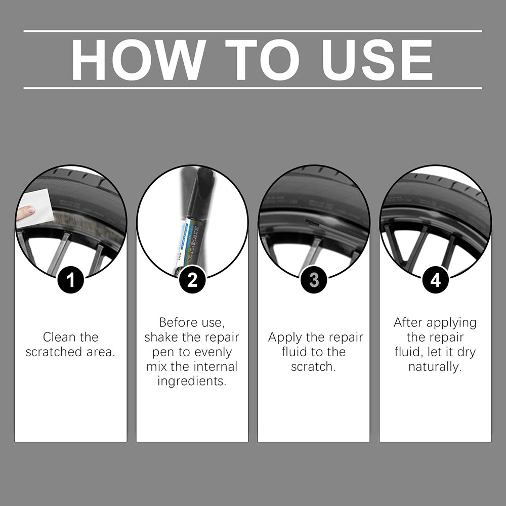 [Easy to Operate] Clean and remove surface grease, then shake to mix thoroughly, according to the depth of damage, use multiple layers of paint to repair minor scratches, and it will take only 10 minutes to dry,No need to remove the wheel.
