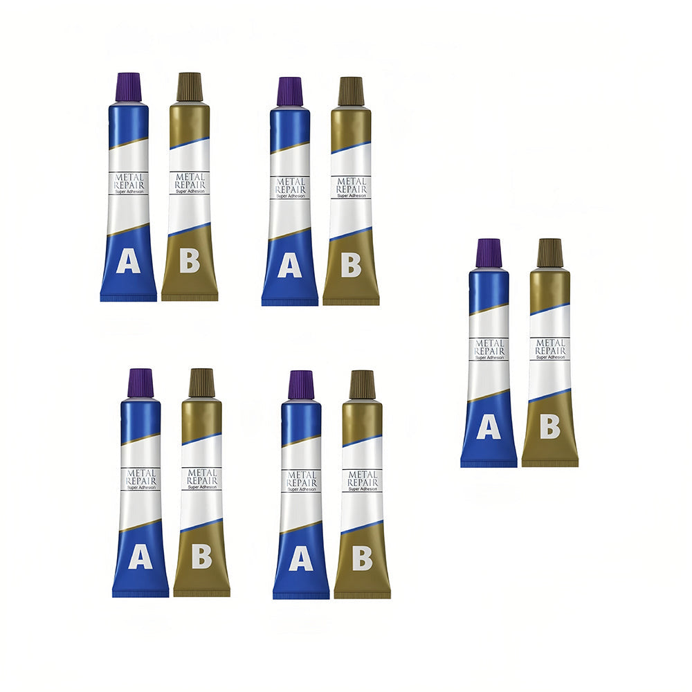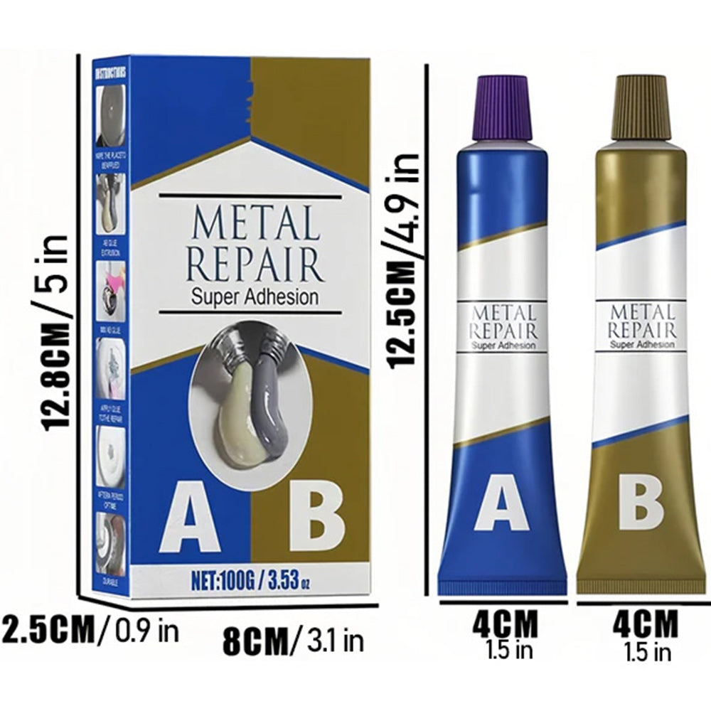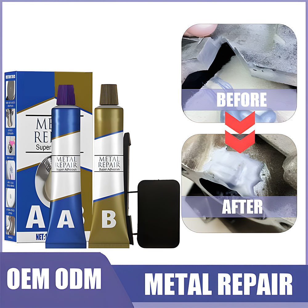 A permanent adhesive is formed after mixing, which can be shaped, beaten, filed, sanded, and drilled after curing. It has a 1:1 mixing ratio, 10 minutes setting, and complete curing within 30-45 minutes, Before using the glue, clean and dry the surface and finish the work within 20 minutes after mixing.