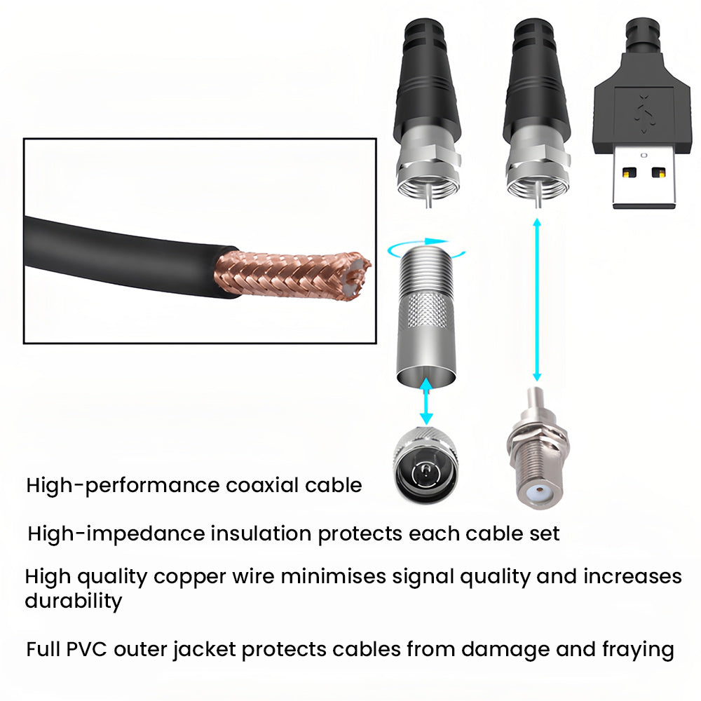 - Long cable - The long coaxial cable makes it easy to place the aerial in the best reception spot in your home. The antenna can be powered either from a wall socket or the USB port of a TV.