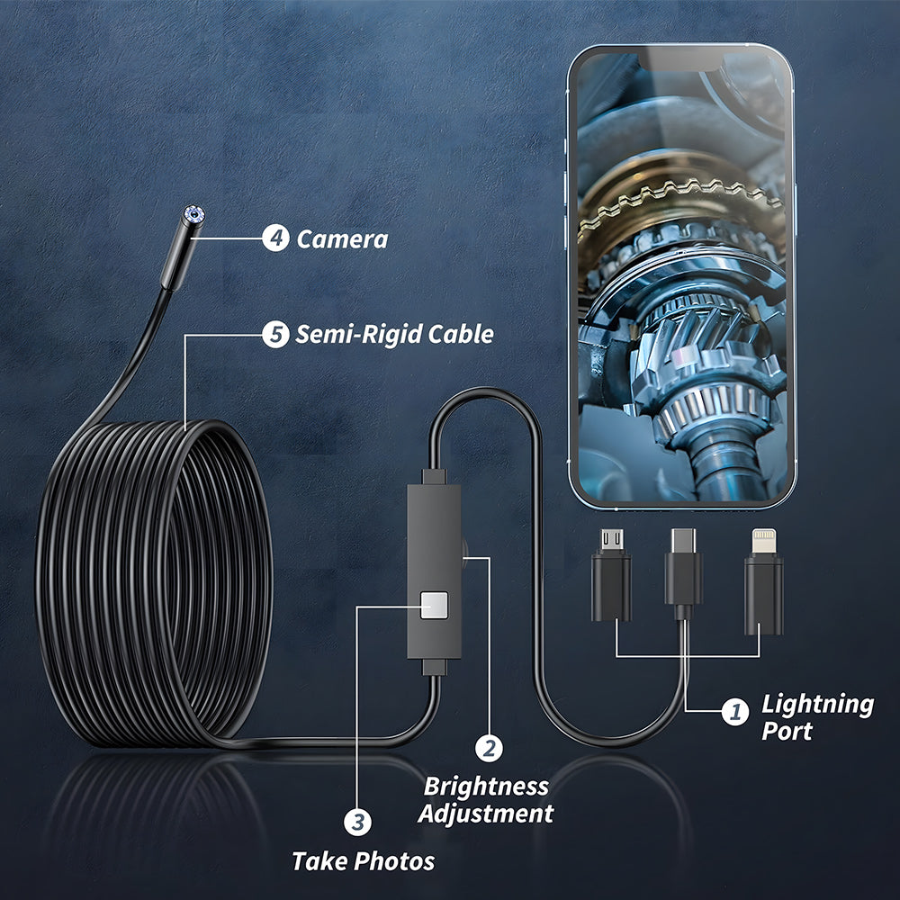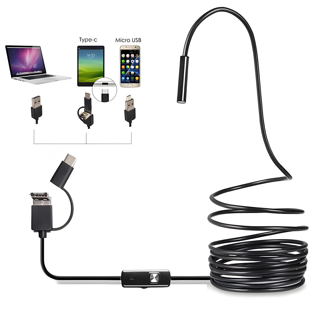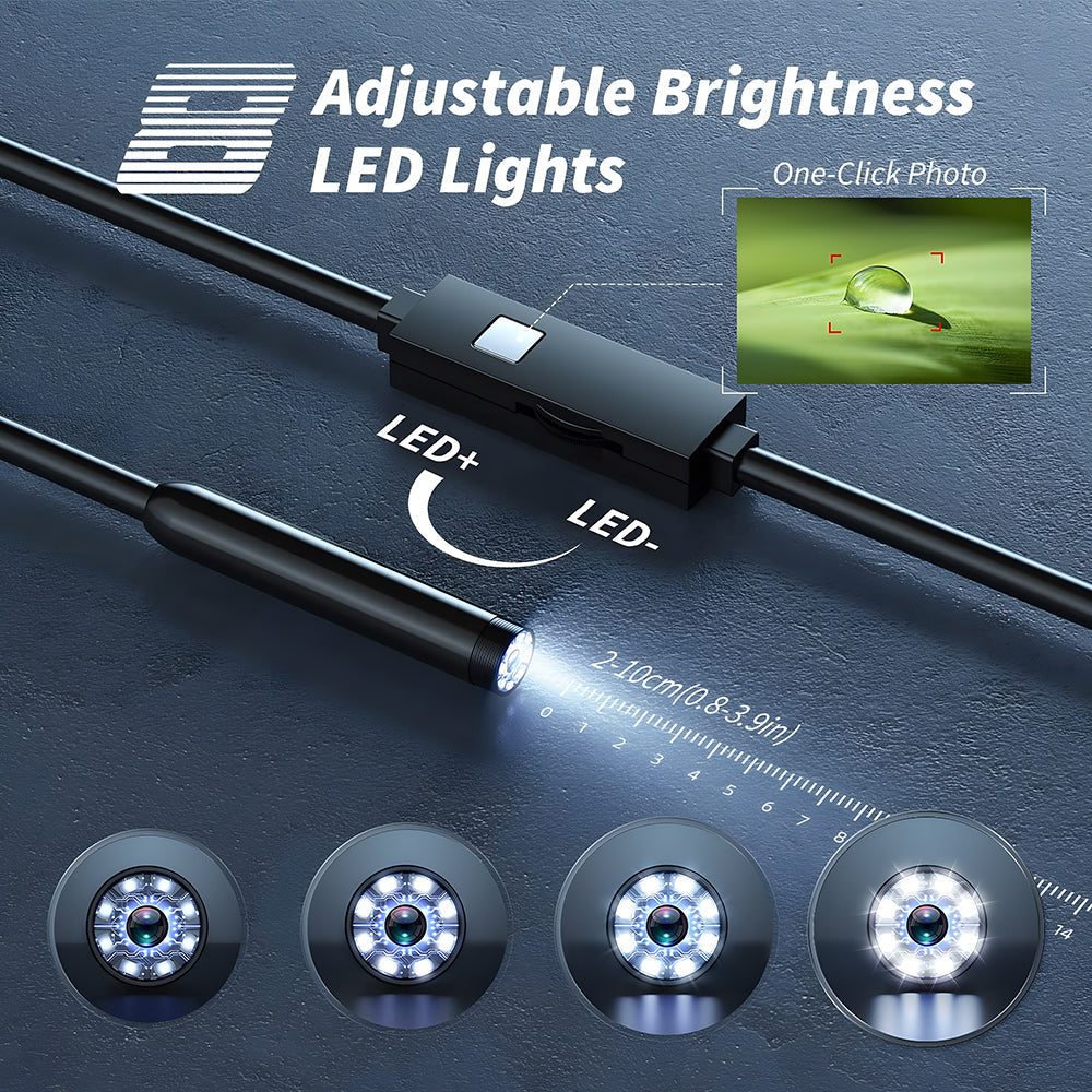 - Powerful Capability: 3 in 1 USB / Micro USB / Type-C Endoscope Inspection Camera, IP67 Waterproof Camera and Adjustable LED Light, so you can set 6 adjustable LED light brightness when working in a certain area with low light.