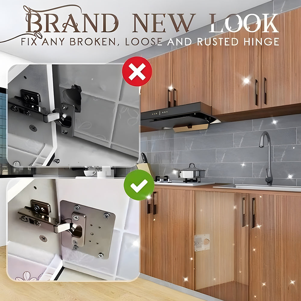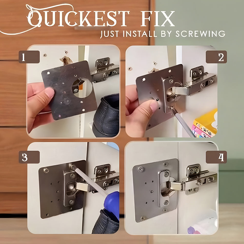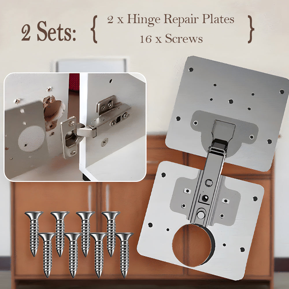- ăQuickest Hinge FixăThis hinge repair kit comes with everything required to fix any broken, loose and rusted hinge. Simply align the repair plate with your current hinge and screw it to fix the hinge firmly.
