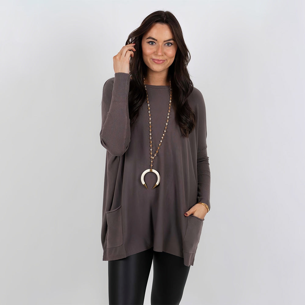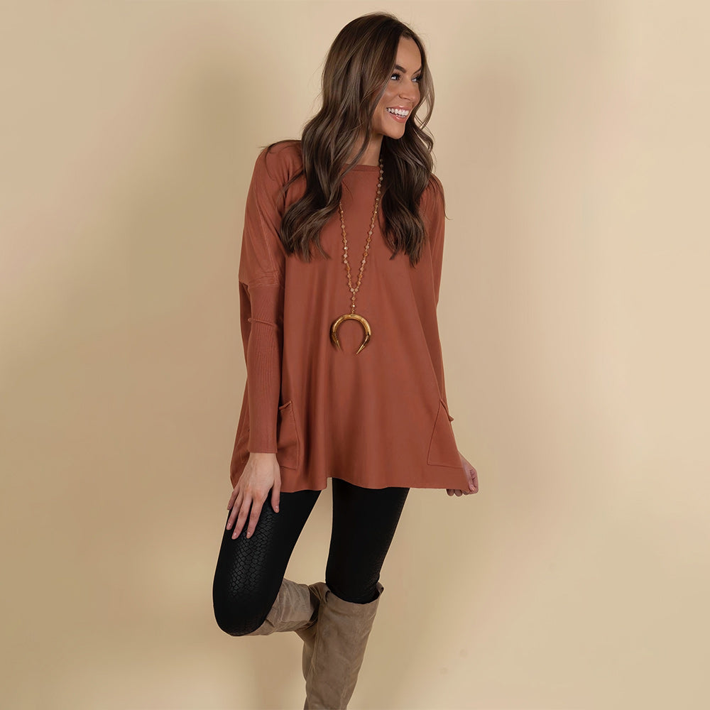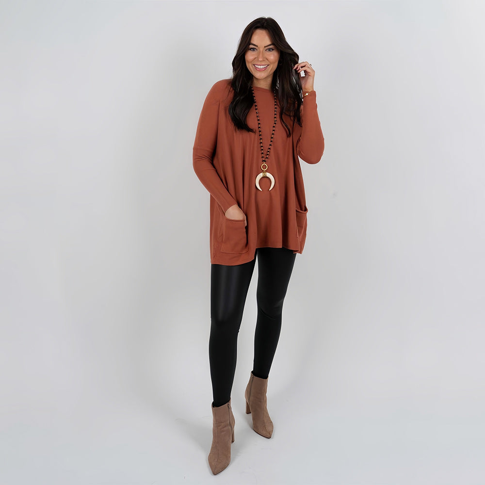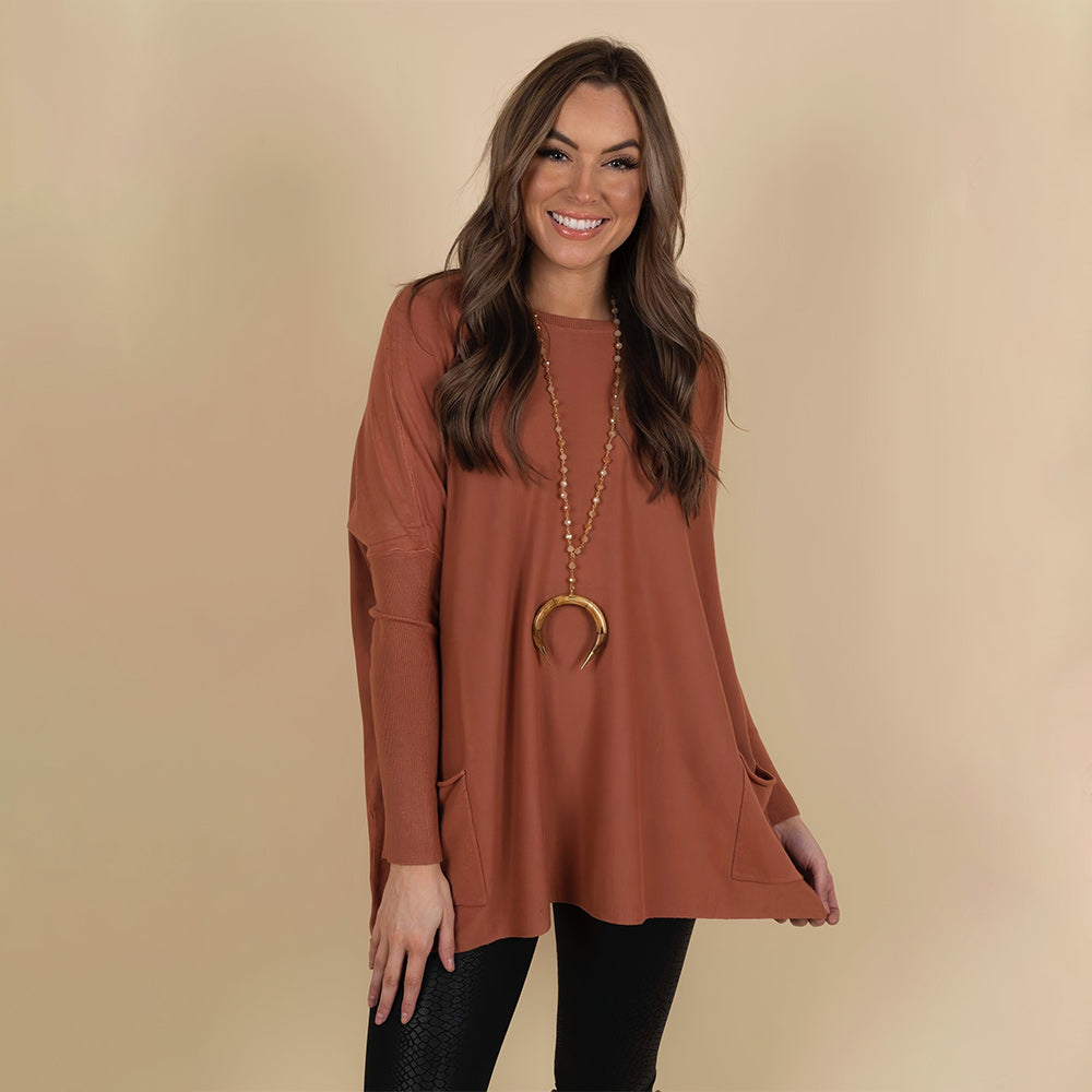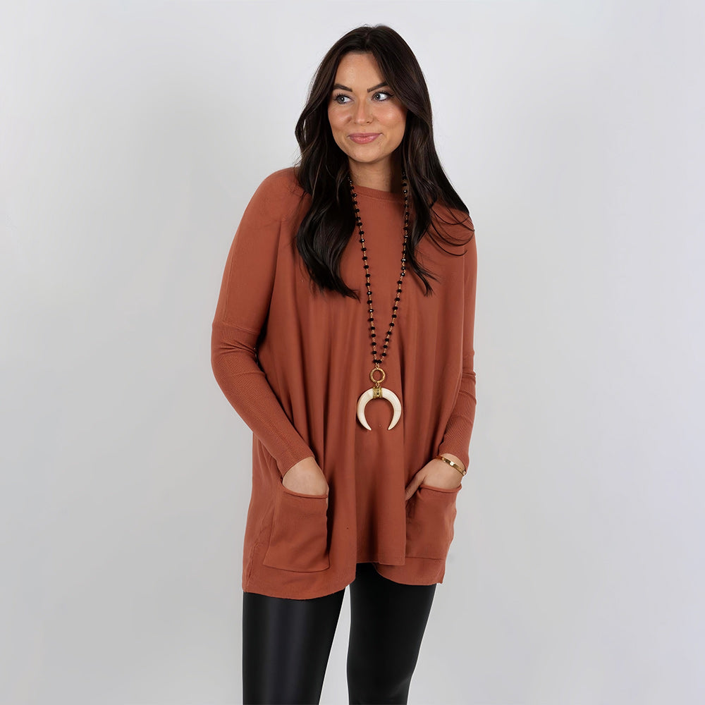You'll be completely smitten with this gorgeous sweater. This sweater has an oversized fit with front pockets and a crew neck!