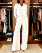 Women's Solid Color V-neck Top & Pants Two-piece Set: Stylish women's essential! Solid V-neck top & matching two piece sets for women, effortless elegance for everyday wear. Showcase your confidence with this chic two-piece